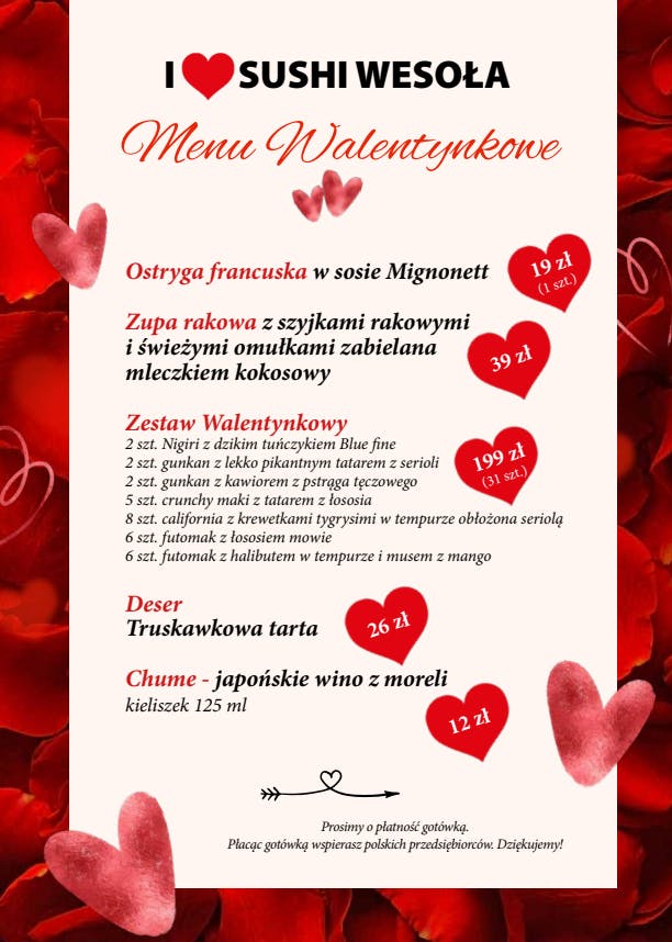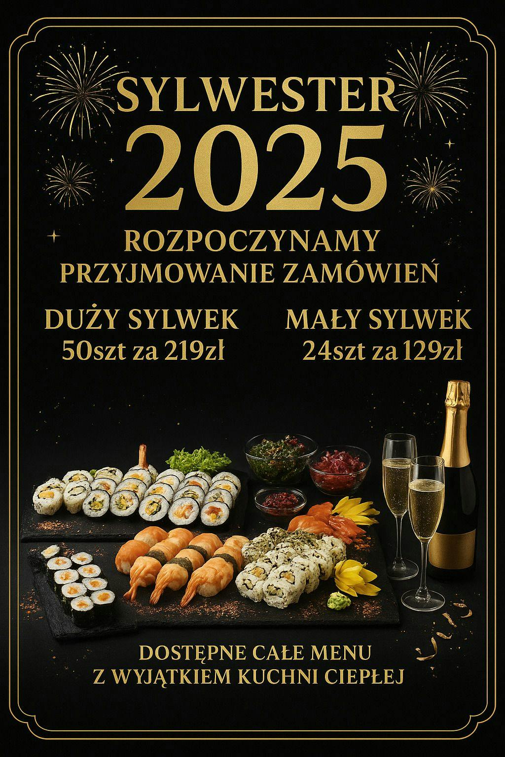 Poza zestawami sylwestrowymi możesz zamawiać dowolnie z karty(dostępne wszystkie pozycje oprócz: kuchni ciepłej, przystawek ciepłych, zimnych ramenów, udonów i zup).